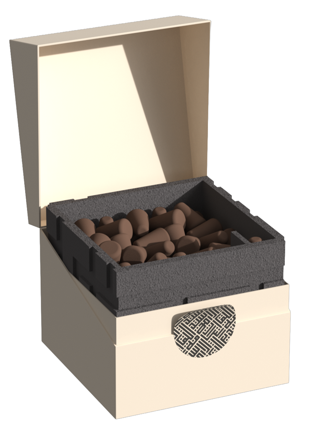 The box is crafted from recycled metal. The incense cones are made from organic oud wood and natural perfume oils. All cones are packed in an organic paper box with no plastic components.