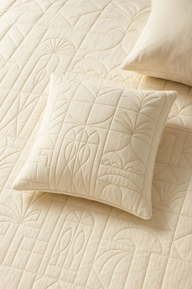 Patterned stitching, organic camel-milk fabric, versatile sizes, timeless heritage design. Soft comfort, healthy sleep, honors tradition,