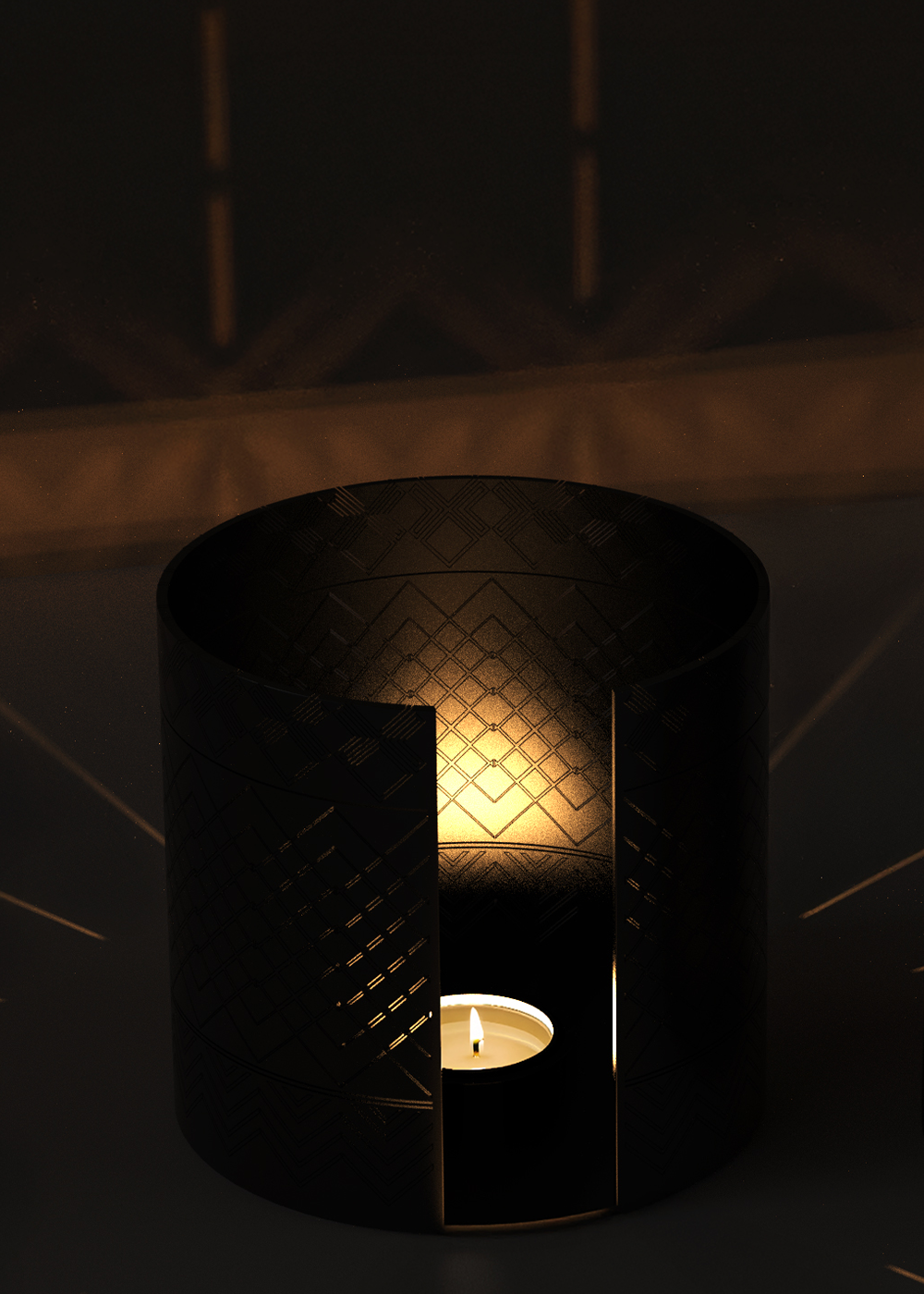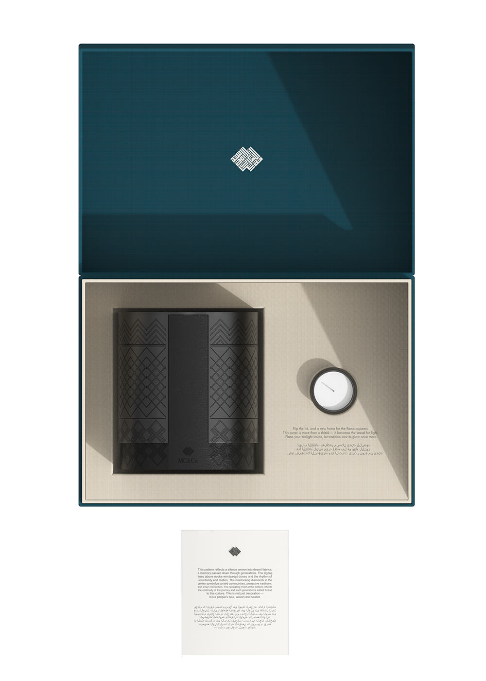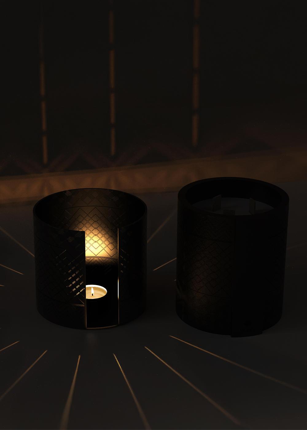 A sculptural candle and tealight holder that captures the poetry of Al Sadu weaving through engraved geometric patterns. The design allows light to reflect beautifully from within, creating a double light , one from the candle itself, and another from its mirrored glow on the patterned walls. Both functional and symbolic, it transforms tradition into a timeless, modern object.