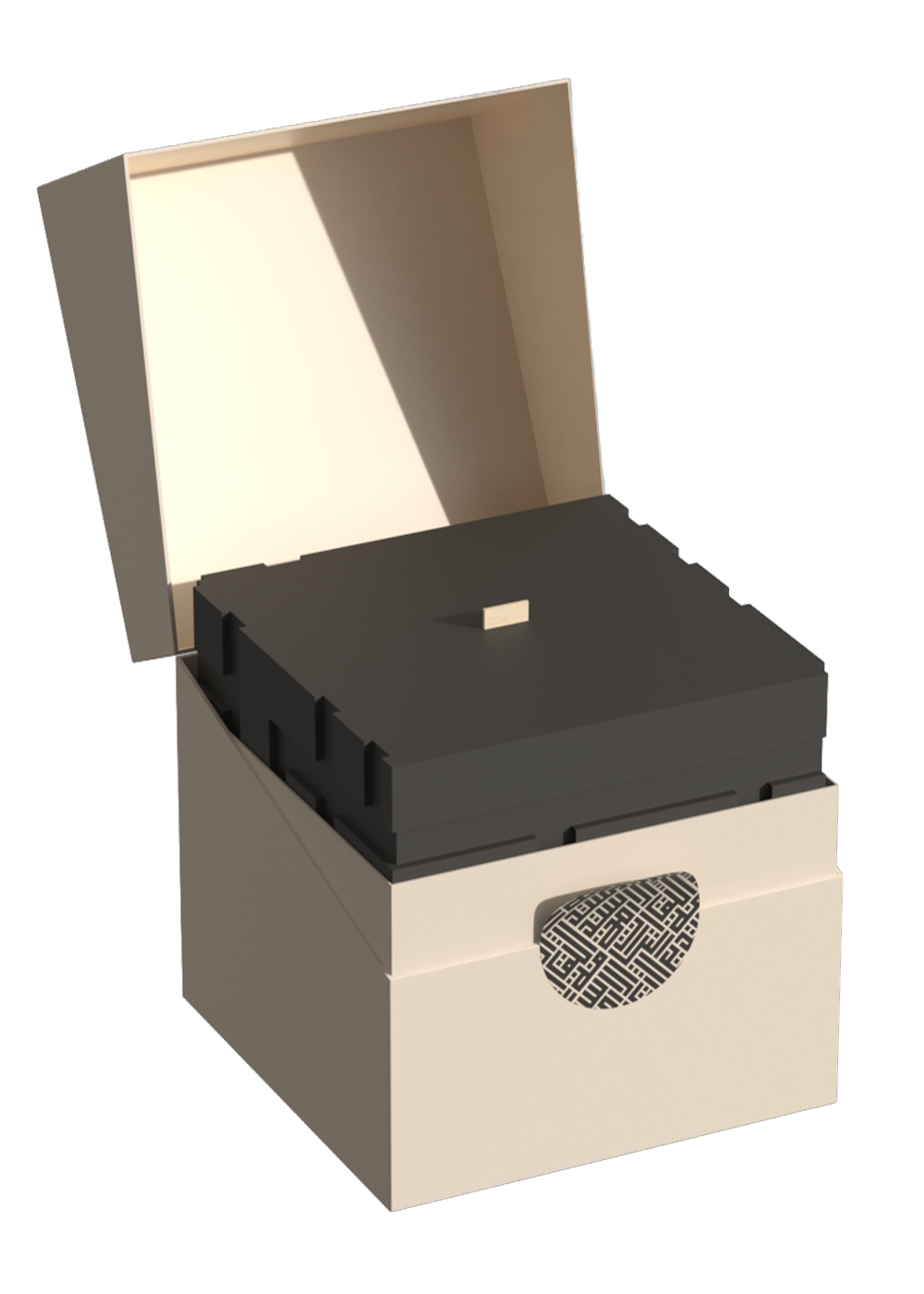 A sculptural candle designed to celebrate the light and renewal of Eid. The geometric form carries a modern interpretation of traditional Kufic patterns, symbolizing unity and gratitude. The candle burns cleanly and evenly, releasing a soft natural fragrance that evokes calm and reflection. The design rests on a recycled metal base, giving it both weight and permanence — a piece to keep long after the flame has gone.